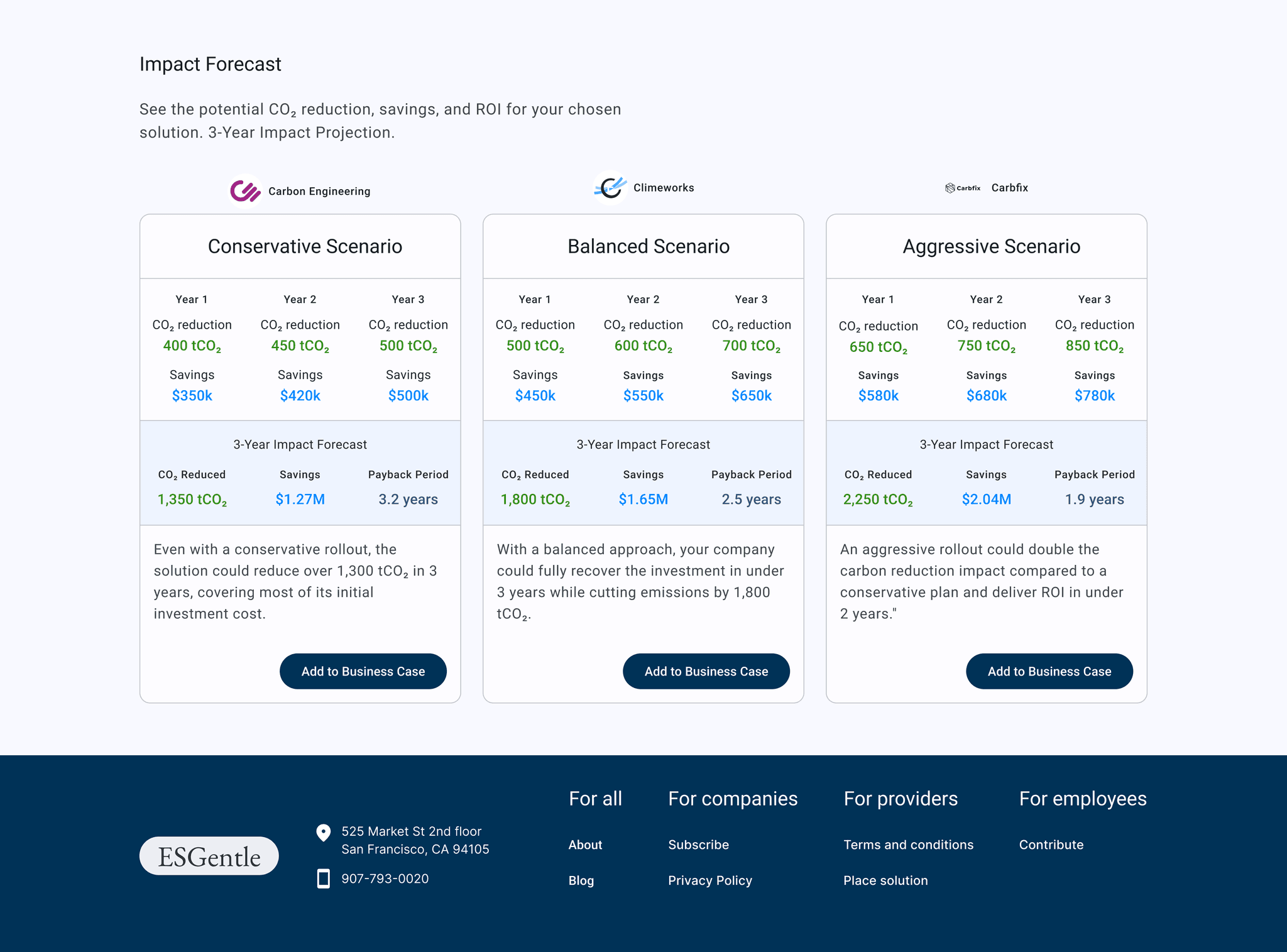 Designed an intuitive comparison feature for a sustainability marketplace, enabling managers to evaluate solutions by price, impact, and ROI in a single flow.